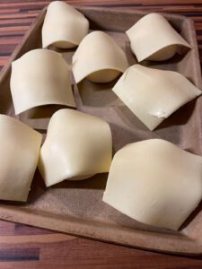 4. Het deeg uit de kom of mixbeker halen en op de licht met meel bestrooide u0022teigunterlageu0022 leggen. De deeg in 8 stukken verdelen. Ieder deegstukje goed opbollen en op spanning brengen.