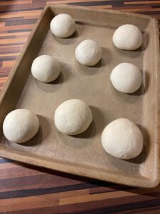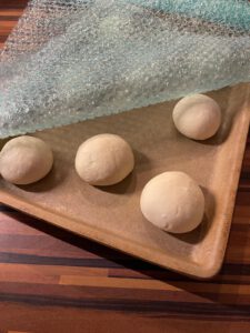 5. Neem een platte steen van Pampered Chef (zoals de Zauberstein, Ofenzauberer of White Lady) en vet deze in met kokosvet. Verdeel de deegbollen gelijkmatig over de steen. Laat de bollen nog 10 minuten rusten onder een theedoek of een stukje bubbelplastic. Verwarm ondertussen de oven voor op 220 °C (boven- en onderwarmte).